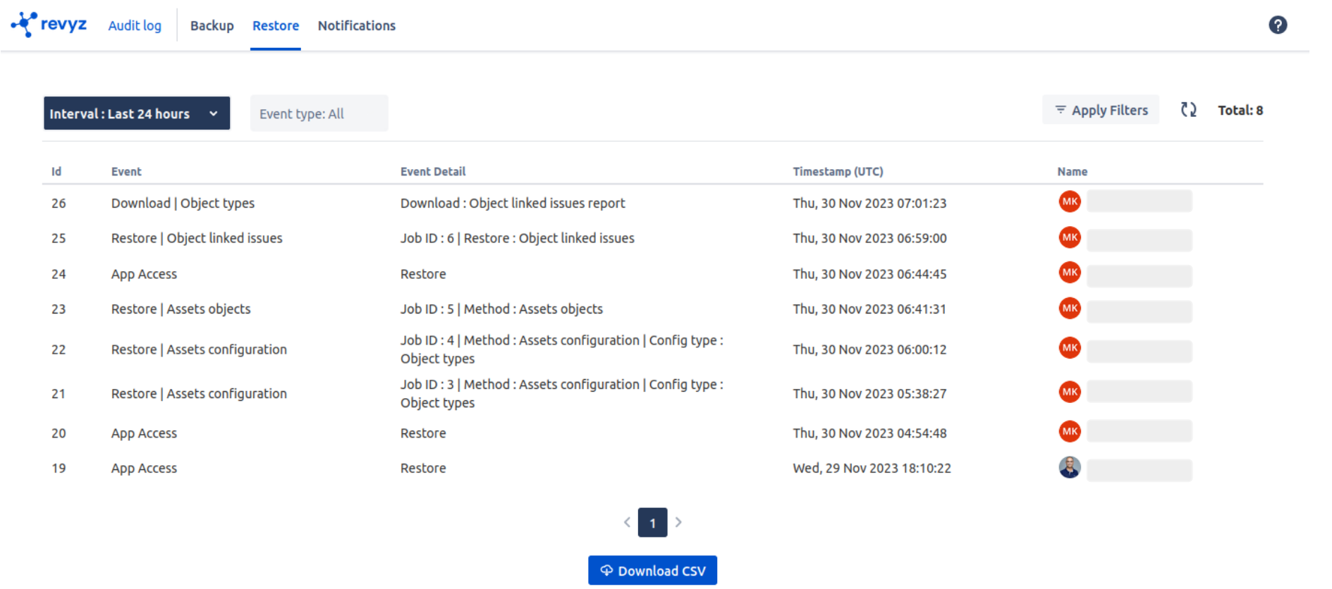 Audit log gives you the visibility of all the actions taken within Revyz Assets Data Manager app