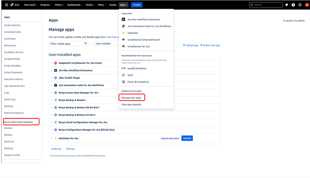 In the left navigation of the “Apps” page you will see the “REVYZ ASSETS DATA MANAGER ”menu