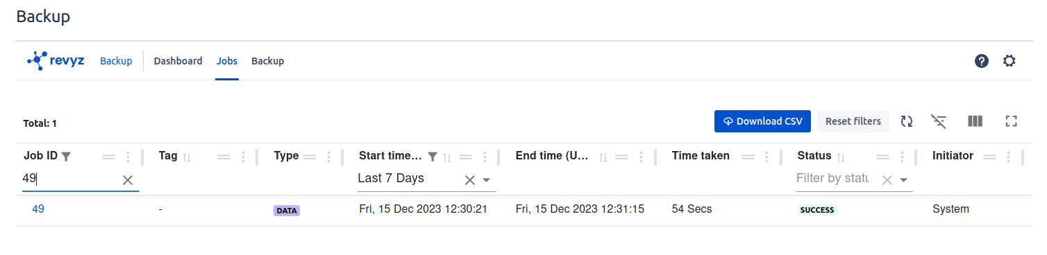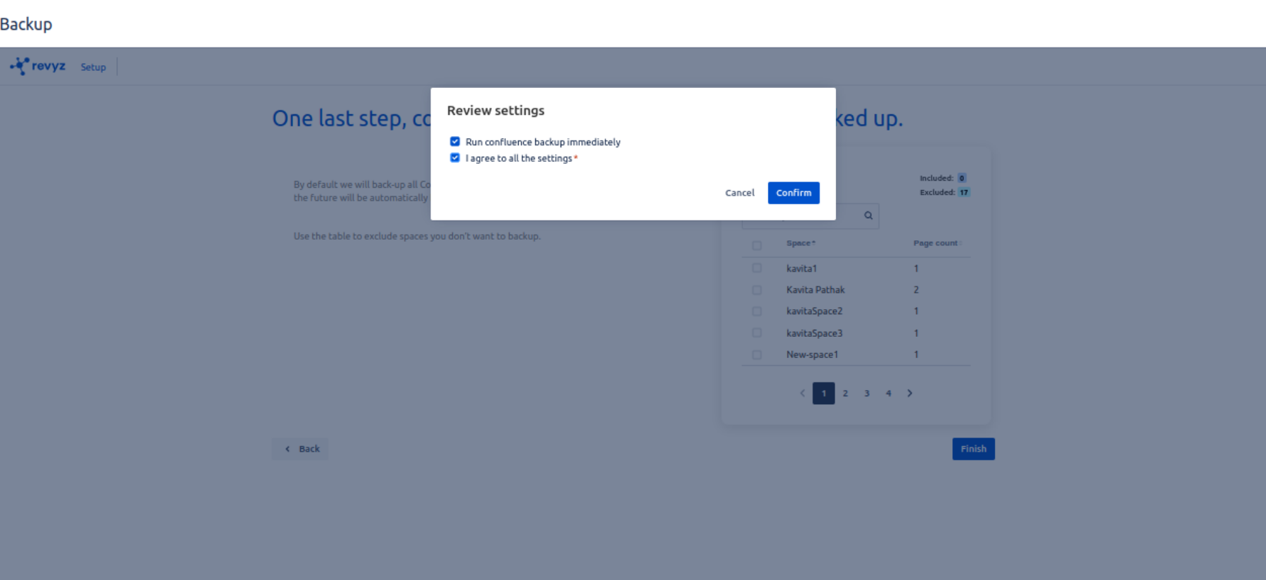 In the “Jobs” page you will see one backup job that are automatically created for you, that job is to backup all the “Confluence Data” in your site.
