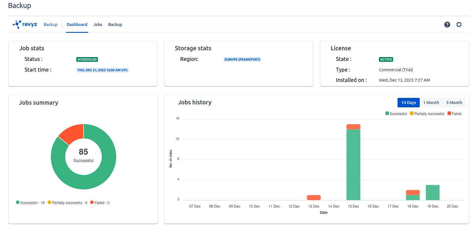 After installing the app you will see Backup Dashboard which will give information about Job stats, Storage stats, License, Job summary & Job history