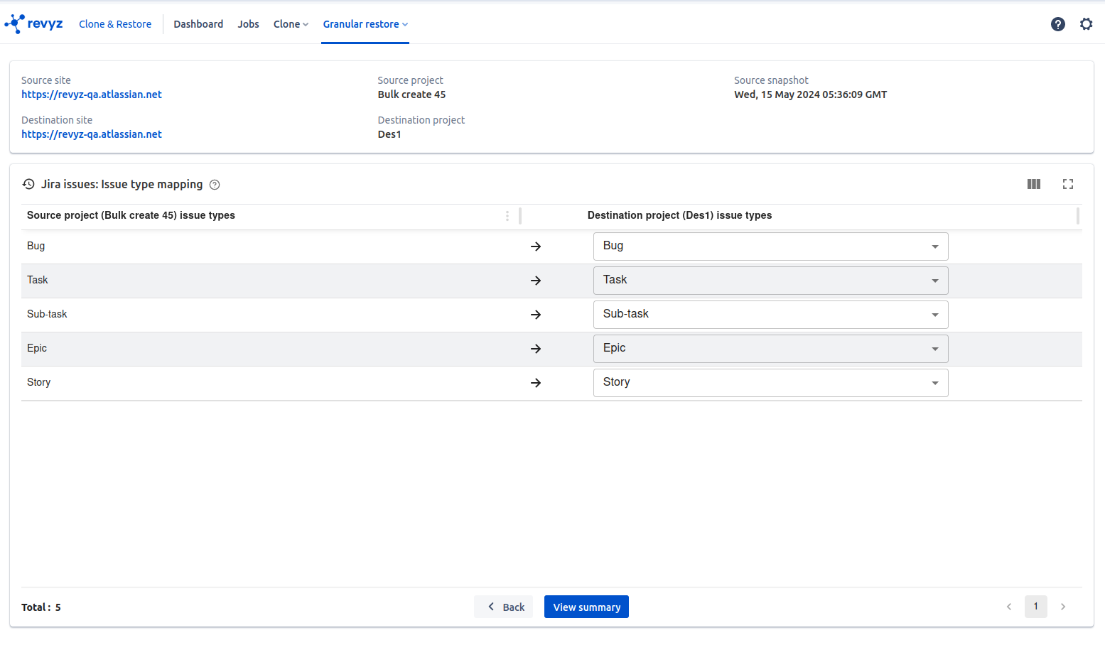 Click on ‘Next : Map issue types’ - It will automatically map issue types of Source and destination site. If issue type is not present on destination then you have to map it manually.