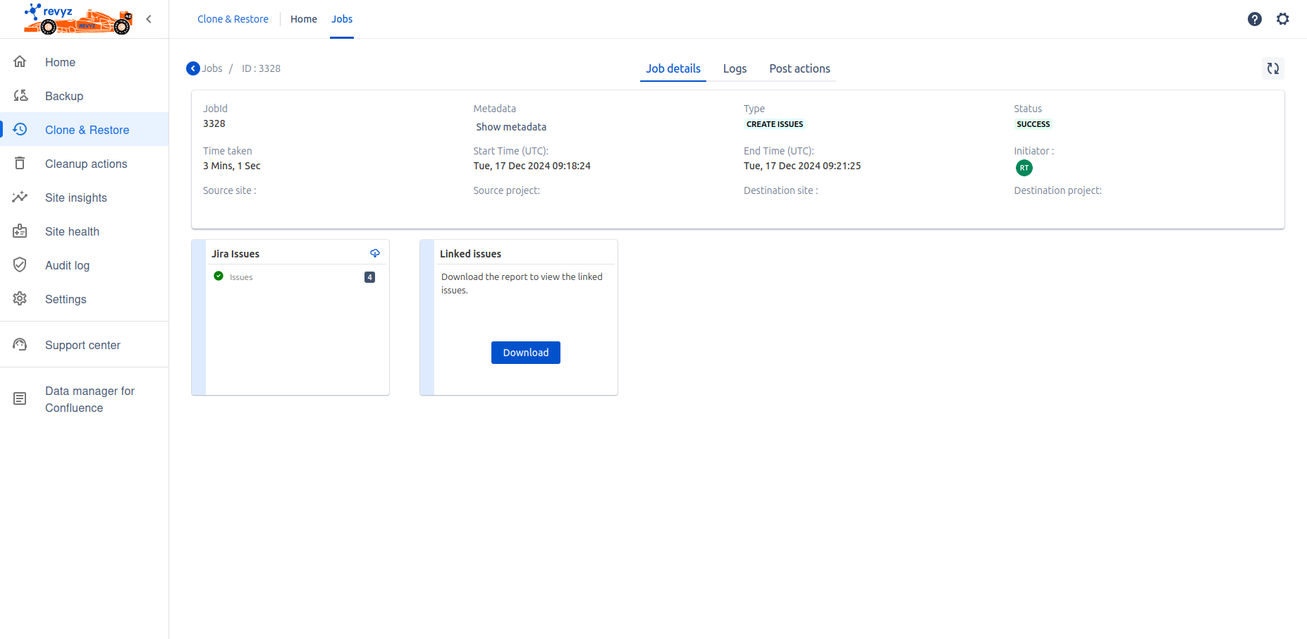 You can download restored issues from Jira issues card. Also you can see Linked issues from linked issues card.