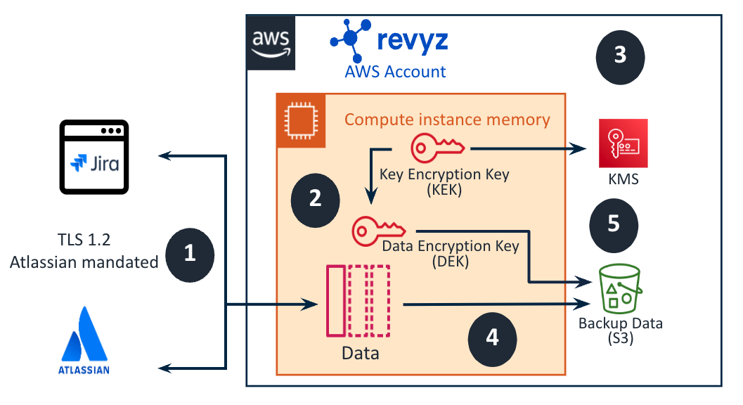 A unique data encryption key (DEK) is generated per “n” objects used to encrypt data at-rest stored in S3. Objects references Jira issues, attachments and configuration elements within Jira