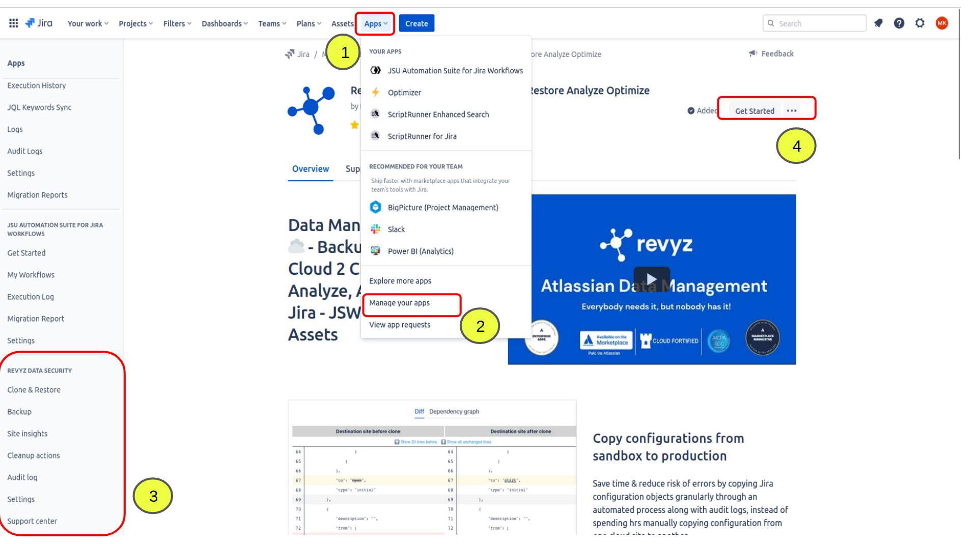 In the left navigation of the “Apps” page you will see the “REVYZ DATA SECURITY” menu