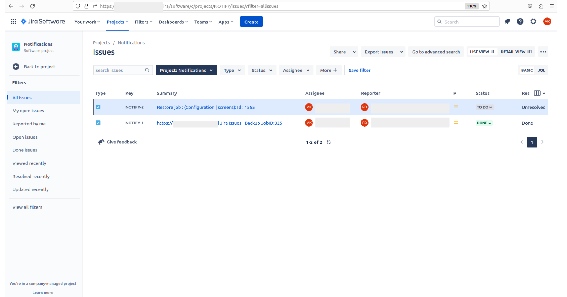Revyz will create ticket for each action i.e after triggering backup jobs, restore jobs, Cleanup actions jobs & notify you through email. Revyz will create issue ticket and associated it to project you created. In that project you can check all the created issues.