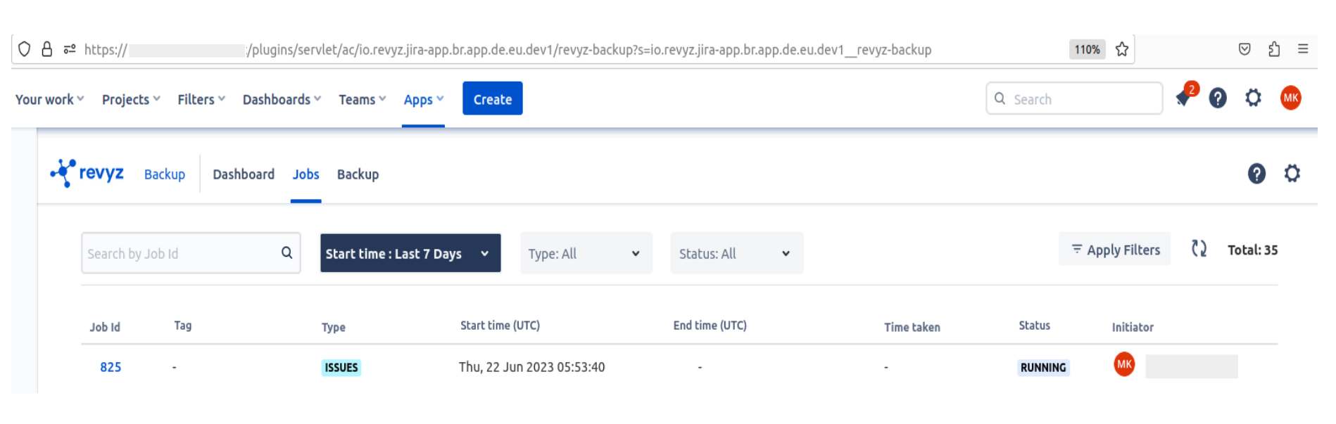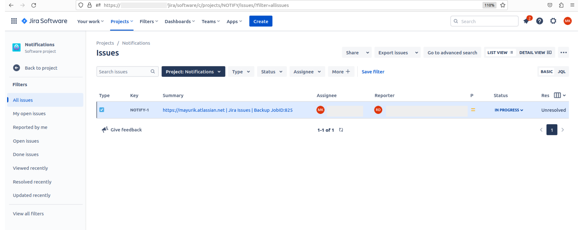 In following screenshot, triggered backup job is in running state and created issue is in In Progress state